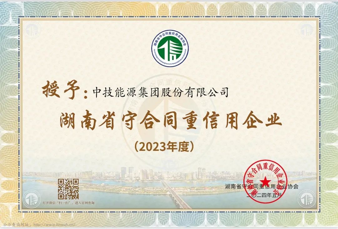 Recently, the Hunan Provincial and Changsha Municipal Associations for Contract-observing and Credit-valuing Enterprises successively issued announcements, awarding China Tec Energy Group Co., Ltd. (hereinafter referred to as "China Tec Group") the titles of "2023 Hunan Provincial Contract-observing and Credit-valuing Enterprise" and "2023 Changsha Municipal Contract-observing and Credit-valuing Enterprise".