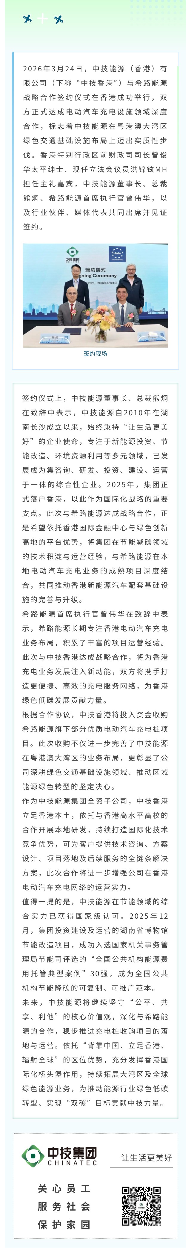中技能源(香港)与希路能源签署战略合作协议 携手拓展香港电动汽车充电业务